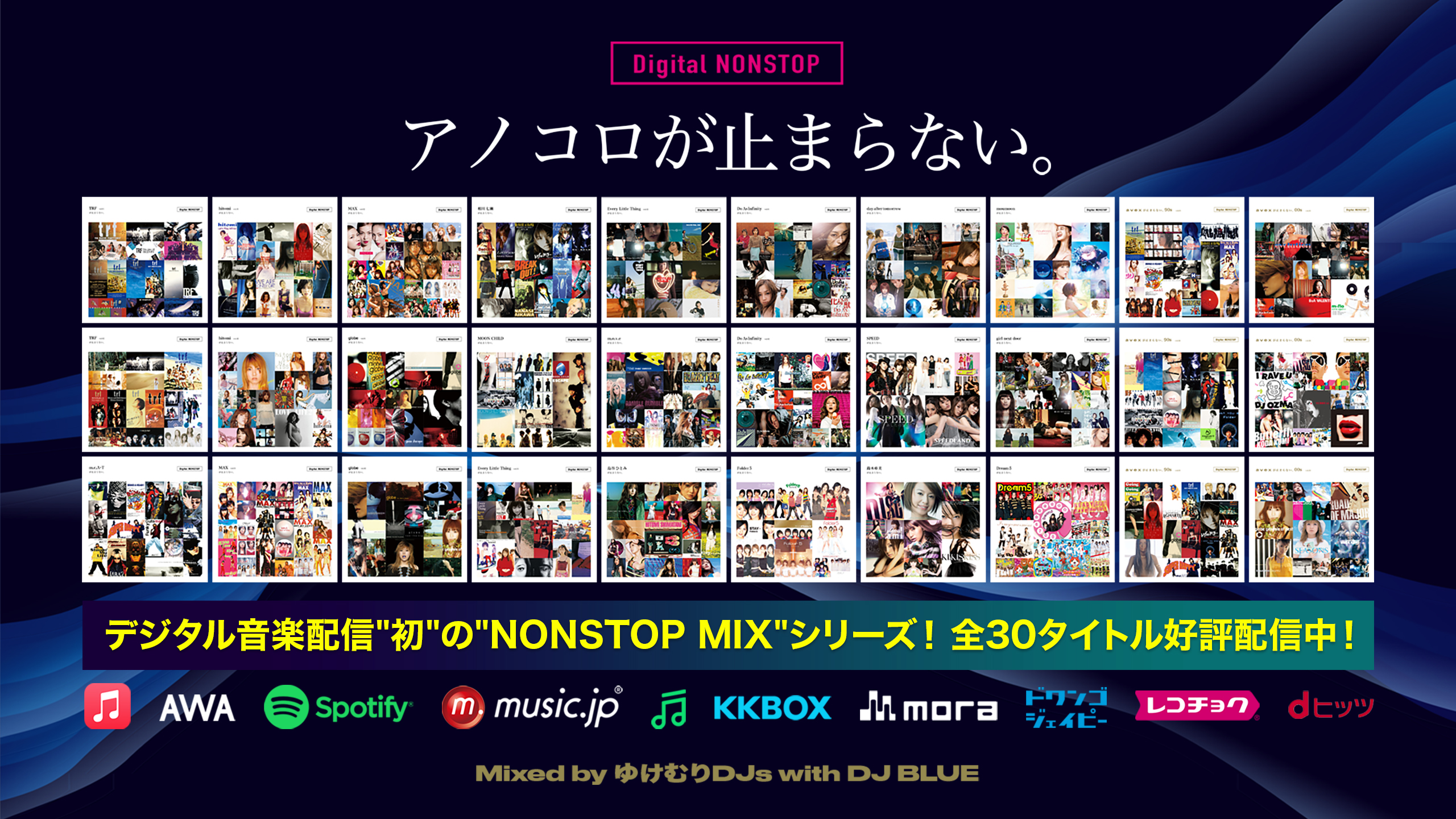 デジタル音楽配信”初”の"NONSTOP MIX"シリーズとして、今年1月にリリースした"「アノコロが止まらない。」Digital NONSTOP"、がサービス開始以降、配信好評につき追加タイトルが続々と決定!!音楽配信サービスにて、シリーズ合計30タイトル配信中!
