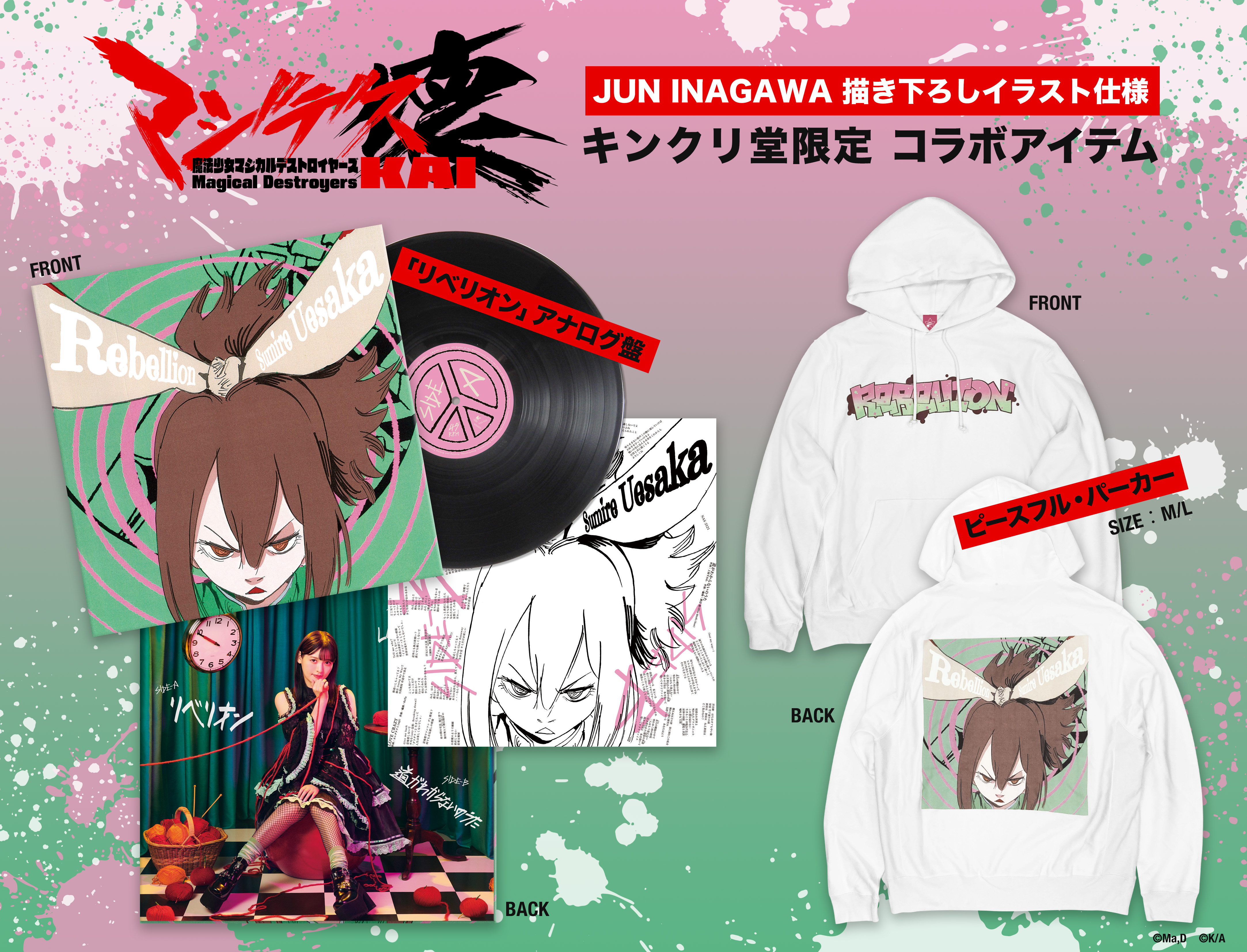 加えて、昨日のDAY1「運命の書」公演では、ゲーム『マジデス壊 魔法少女マジカルデストロイヤーズ』とのコラボアイテムとして、主題歌「リベリオン」のアナログ盤、パーカーの発売も告知された。本アイテムは「魔法少女マジカルデストロイヤーズ」の原案を手掛けるJUN INAGAWA氏による描き下ろしイラストが使用されており、4/8(土)18:00よりKING AMUSEMENT CREATIVEのオンラインショップ『キンクリ堂』にて発売となる。数量限定での発売となるので、お買い逃がしなく。