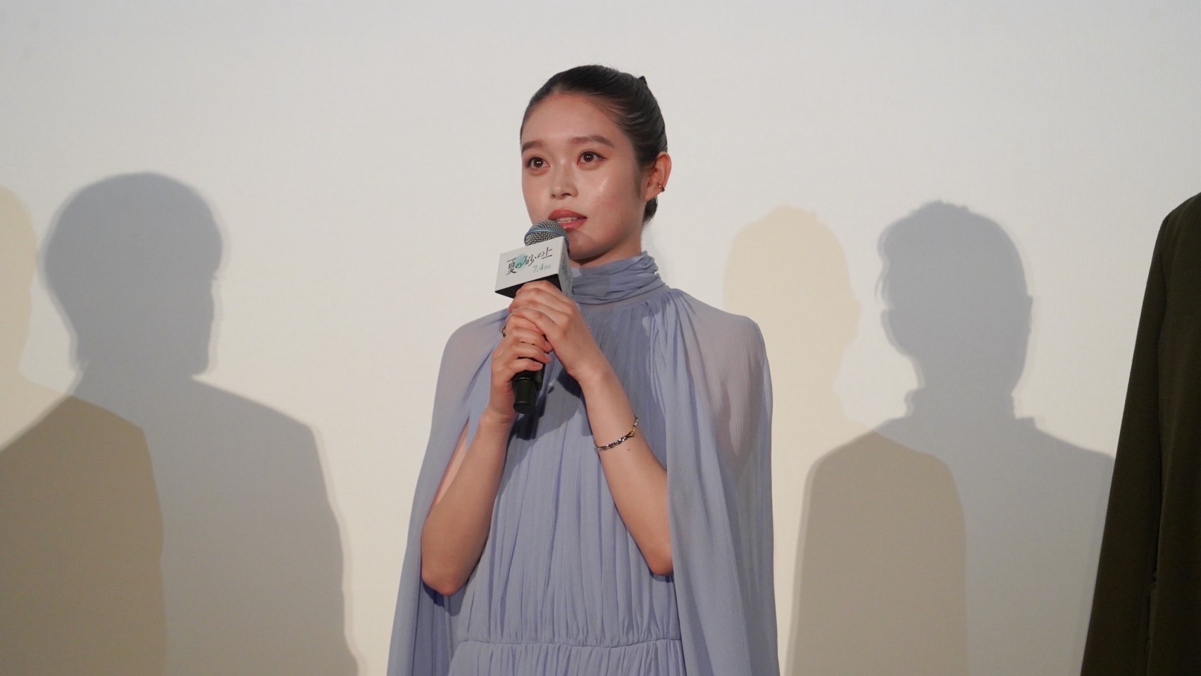 涼しげのある薄い青色のドレスに身を包んだ髙石は共演者や監督と共にステージに登壇。